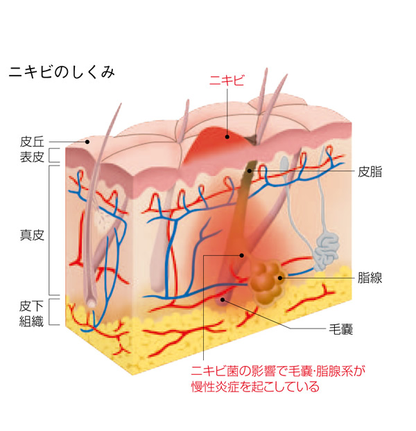 にきび菌はアクネ菌と呼ばれています。実は、このアクネ菌は他の病原菌のように人体に悪い影響を与える菌ではなく、私たちの皮ふや毛包内に普通に存在する常在菌(じょうざいきん)なのです。皮ふを弱い酸性にして他の病原菌の繁殖を抑える役割もはたしています。ただ、アクネ菌は酸素が少なく皮脂が豊富なところ、すなわち毛包内のようなところで繁殖しやすい性質を持っています。このアクネ菌が増殖し、「にきび」の進行の原因になるわけです。