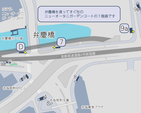 赤坂見附・永田町からお越しの場合は、弁慶橋を渡ってすぐ左手になります。
